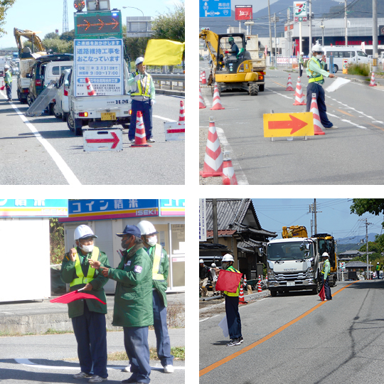 道路舗装工事や、建柱工事等、車両の通行を規制する必要がある現場での交通誘導警備を行っております。一般の通行者にご協力をいただいていることを忘れず、礼儀正しく真面目に業務を行います。